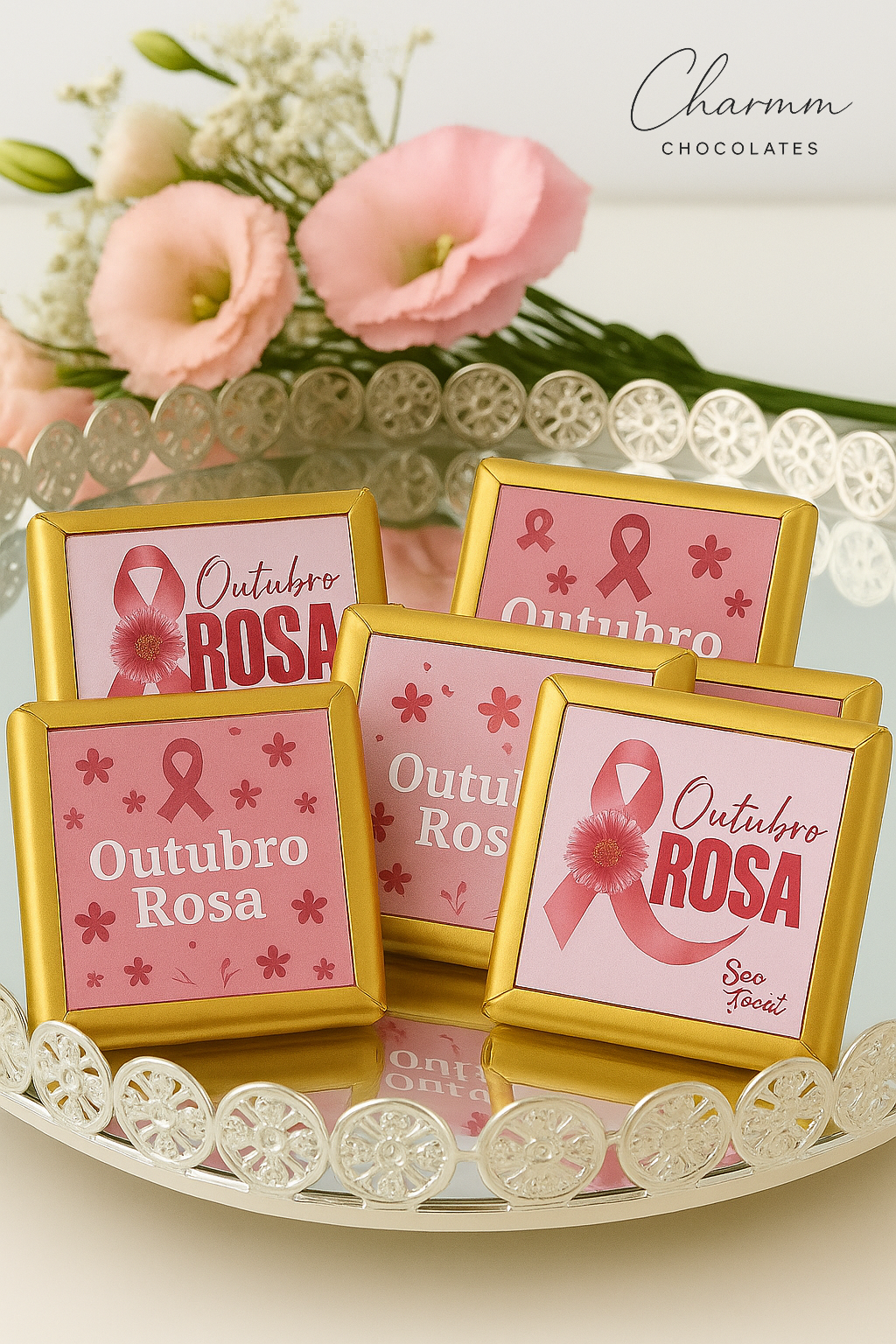 Celebre o Outubro Rosa com um gesto doce e significativo. Nossas barrinhas de chocolate de 12g são cuidadosamente embaladas em dourado e personalizadas com rótulos exclusivos da campanha, tornando-se uma lembrança elegante para compartilhar em consultórios, escolas, empresas e eventos especiais.