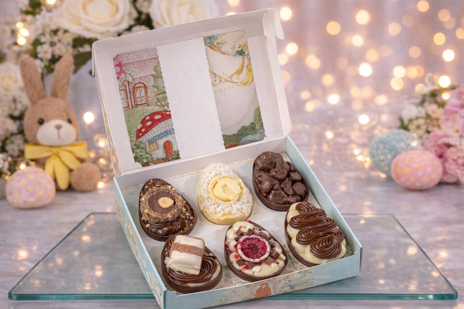 Esta elegante caixa reúne 6 mini ovos de chocolate belga de 50g recheados, preparados artesanalmente com recheios cremosos e sabores irresistíveis.