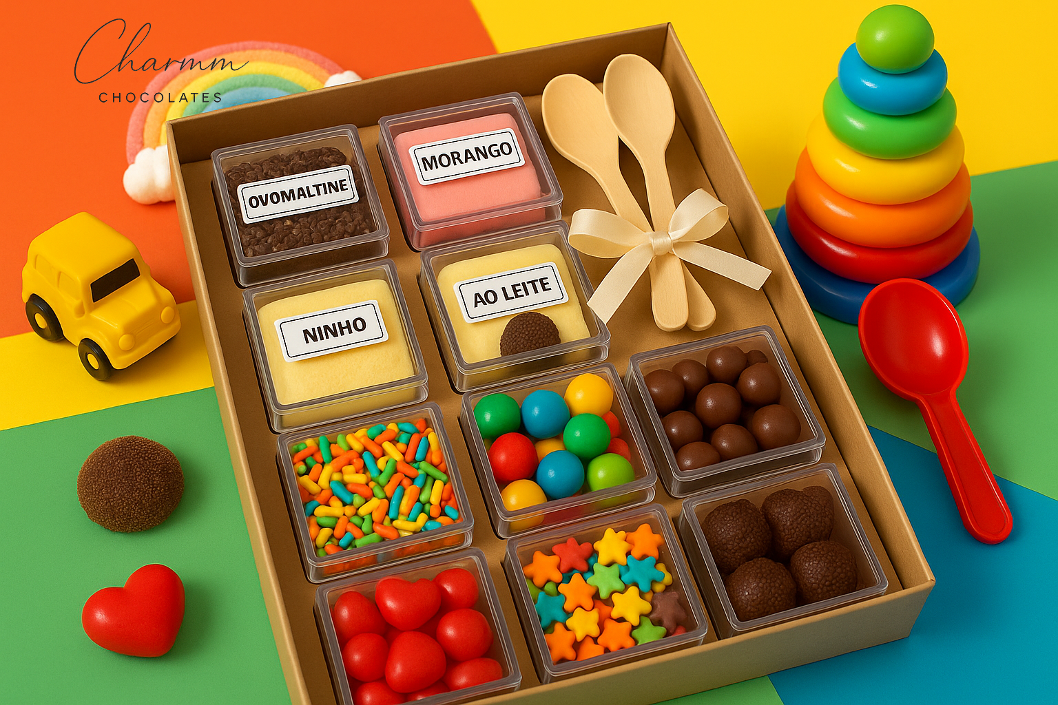 O Dia das Crianças merece ser celebrado com alegria, diversão e muita doçura. Pensando nisso, criamos a Caixa Dia das Crianças Charmm: uma experiência lúdica e deliciosa que une cores vibrantes, sabores irresistíveis e um acabamento encantador.
