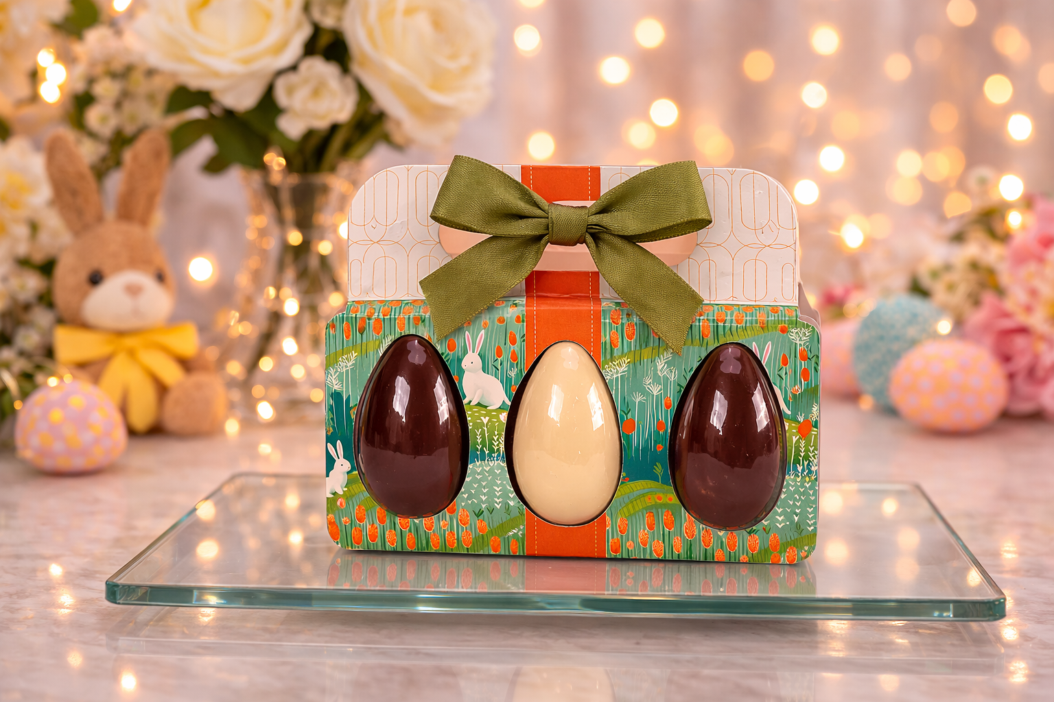 Cada ovo é composto por duas bandas recheadas, totalizando seis bandas de chocolate recheadas. O resultado é uma experiência deliciosa que combina chocolate premium e recheios cremosos em um presente elegante e encantador.