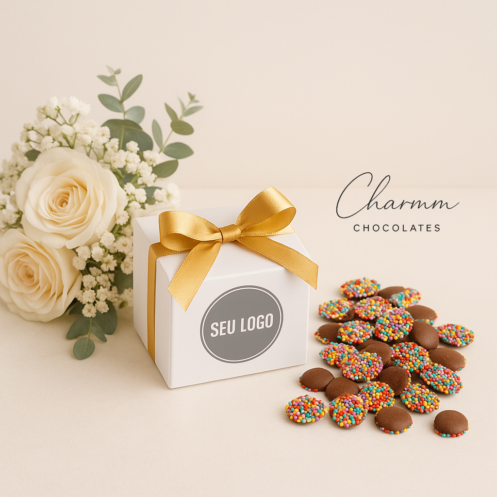 Um mimo sofisticado que combina sabor irresistível e apresentação impecável. Nossas caixinhas vêm recheadas com 100g de dragees de chocolate, cobertos com confeitos coloridos que encantam pelo visual e pelo sabor. A embalagem branca com laço dourado traz a elegância que é marca registrada da Charmm Chocolates, tornando esta lembrança perfeita para eventos corporativos, presentes de clientes, colaboradores ou ocasiões especiais.