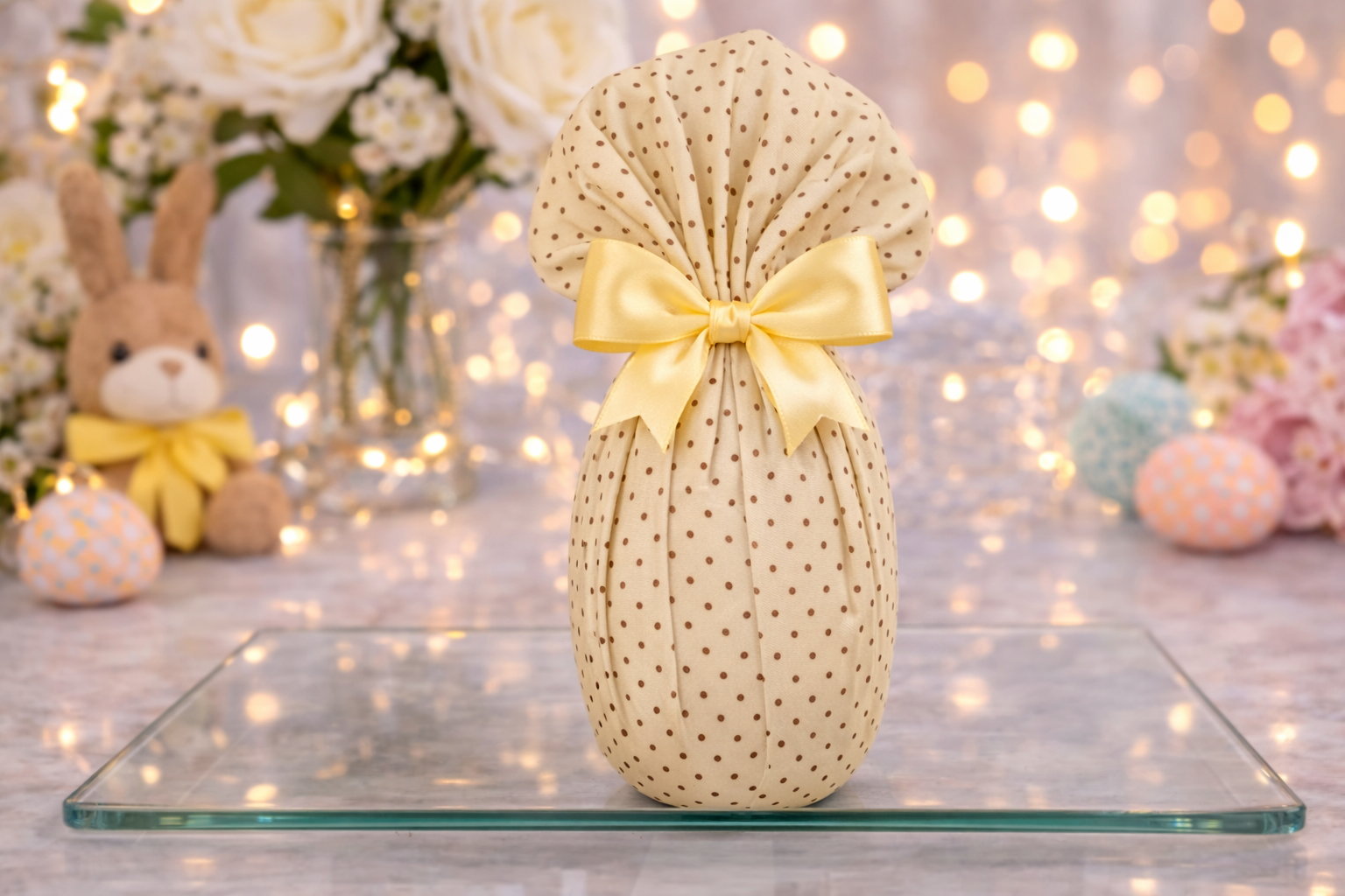 Para tornar o presente ainda mais especial, cada ovo é embalado de forma diferenciada com tecido decorativo e laço elegante, criando uma apresentação sofisticada perfeita para a Páscoa.