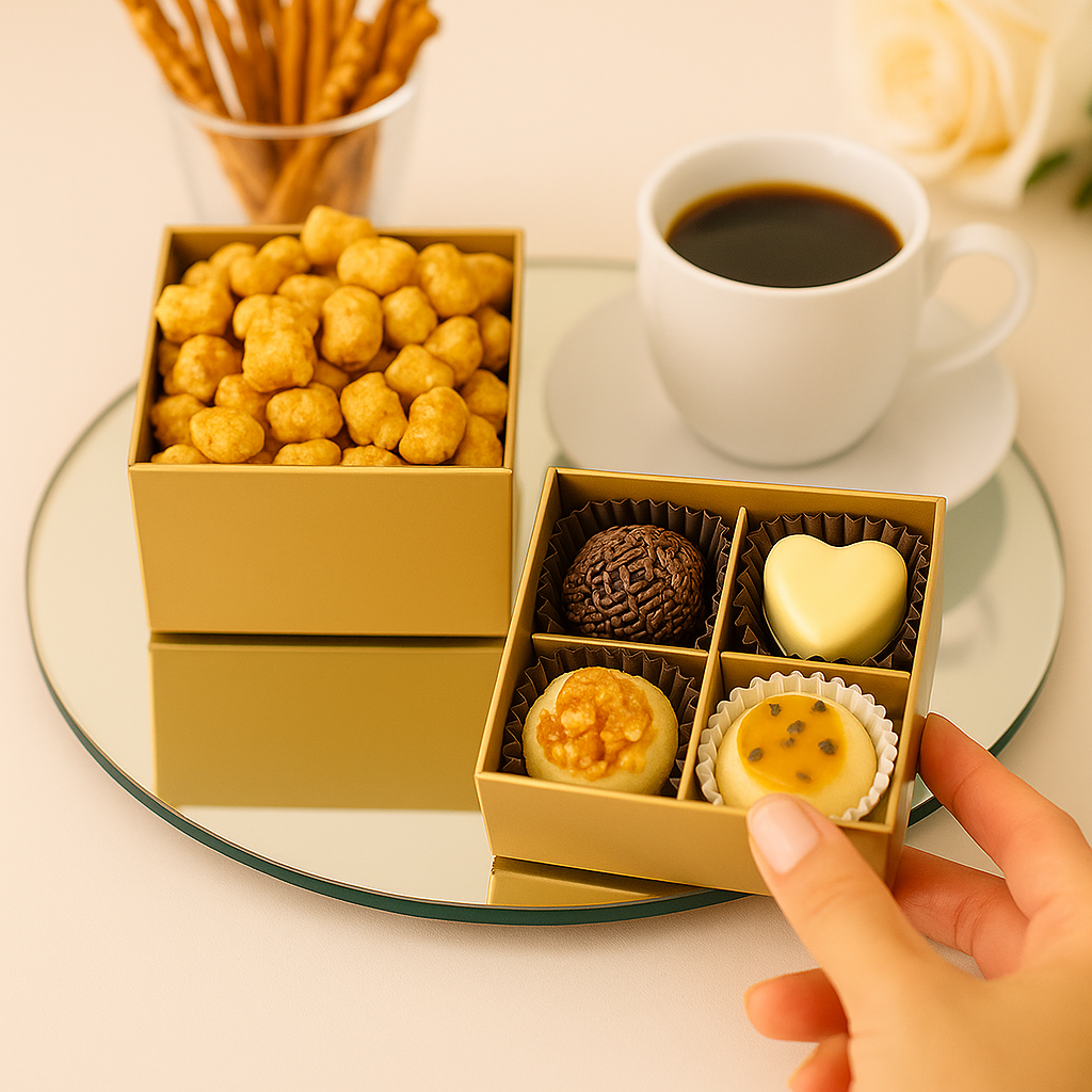 Doce ou salgado? Por que não ambos? Os kits podem ser montados sob medida para ocasiões formais ou descontraídas, com doces gourmet, mini snacks salgados, brownies recheados e bebidas artesanais (sob consulta), tudo com acabamento premium e apresentação impecável.