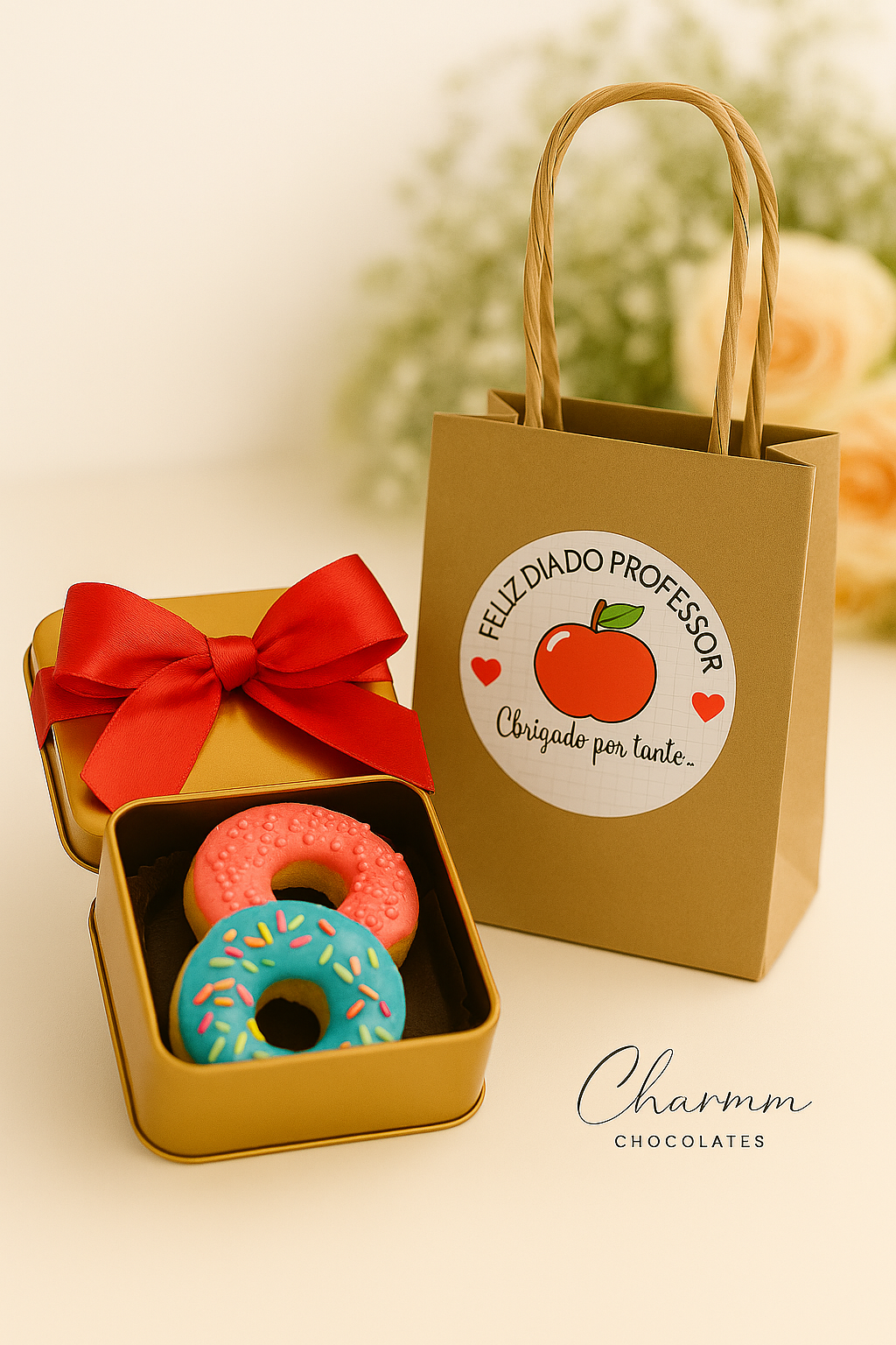 Surpreenda com um presente divertido, delicado e cheio de estilo para o Dia dos Professores. Nossa latinha dourada vem decorada com laço vermelho de cetim e embala 2 mini donuts coloridos, preparados artesanalmente com massa macia, cobertura de chocolate e confeitos vibrantes.