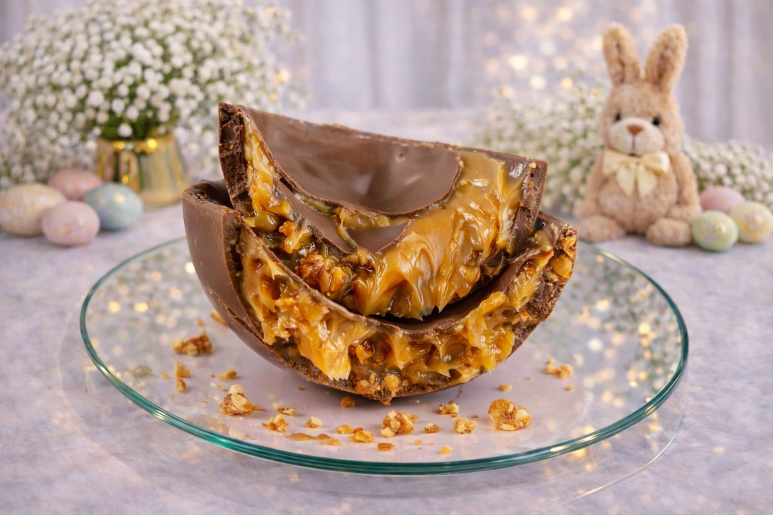 Para quem ama combinações clássicas e irresistíveis, o Ovo de Páscoa de Casca Recheada Doce de Leite com Nozes ou Coco Queimado é uma verdadeira experiência gourmet.
