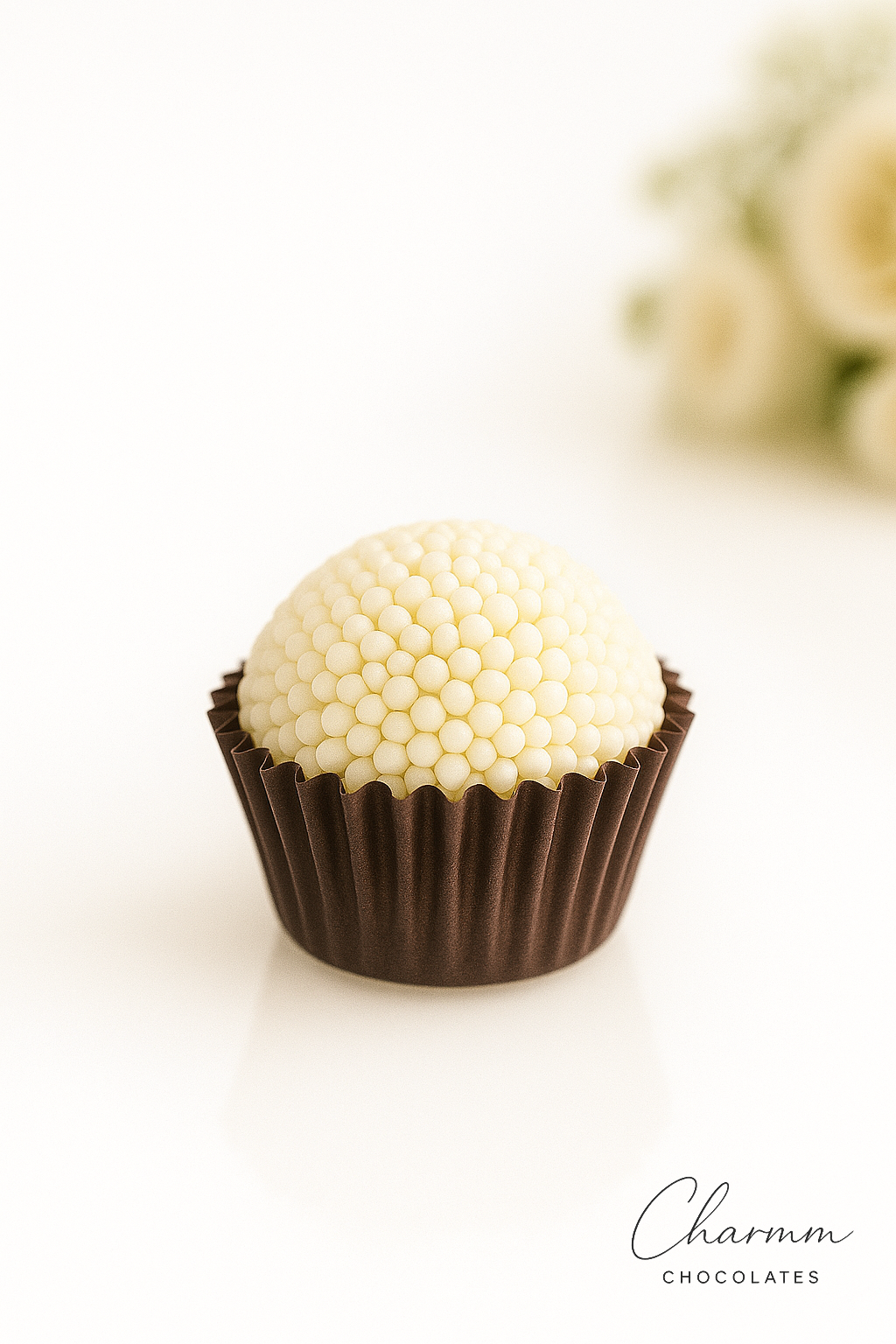 O Perla Bianca é um brigadeiro branco artesanal com textura macia, finalizado com uma cobertura delicada de miçangas claras. Seu visual perolado e sabor suave o tornam ideal para celebrações que pedem requinte e leveza, como casamentos, batizados ou maternidades.