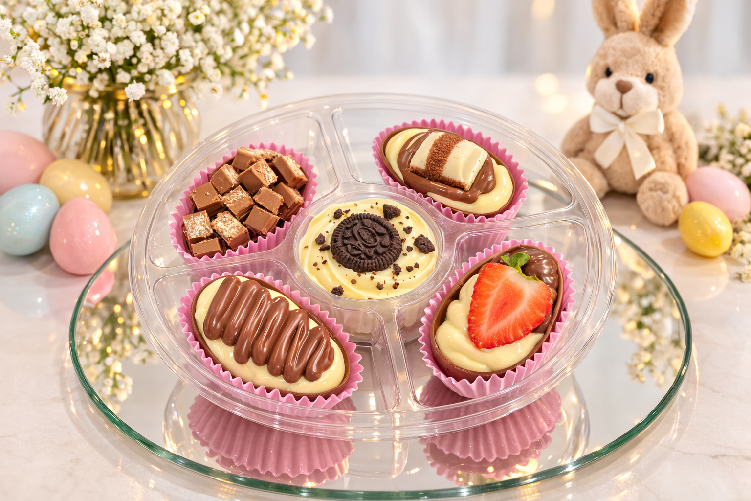 Nesta linda petisqueira, você encontra um quarteto de ovos recheados preparados com chocolate belga e recheios cremosos que tornam a experiência ainda mais deliciosa.